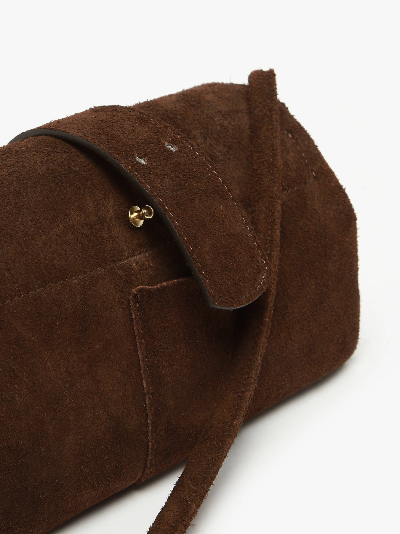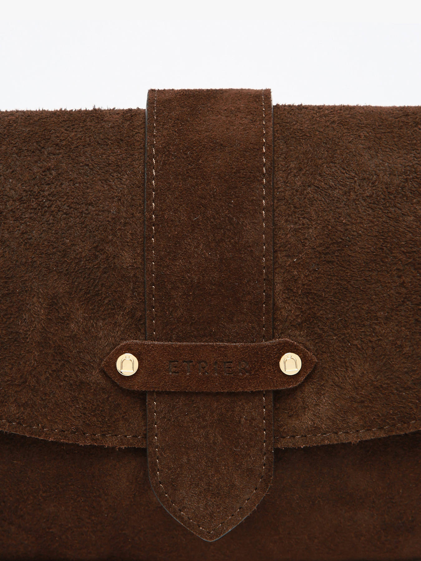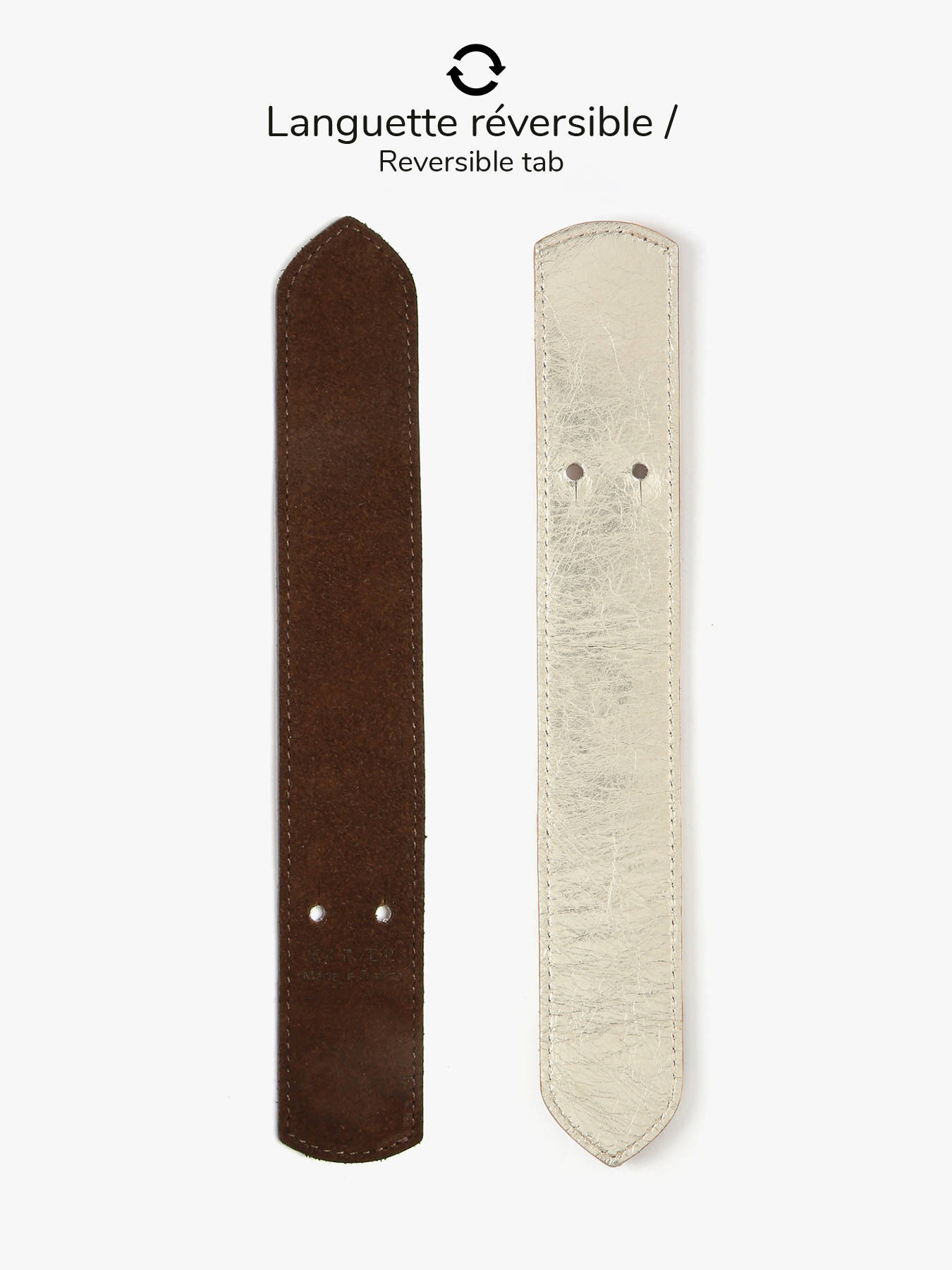 Le sac porté bandoulière AGNES par ETRIER est conçu en cuir velours italien, offrant une texture douce et raffinée. Ce modèle est présenté ici en taille M et se ferme par un rabat doté d'un bouton-pression aimanté. Il existe également en taille S pour celles et ceux qui préfèrent un format plus compact. Le sac est agrémenté d'une languette réversible, composée d'une face dorée et d'une face en cuir assortie au reste du sac. Elle se fixe aisément grâce à deux boutons de col et se glisse dans une poche arrière prévue à cet effet. L'intérieur, entièrement doublé en cuir doré, comprend trois compartiments dont un central zippé, permettant d'organiser vos effets personnels avec confort et élégance. Le fond rigide assure un maintien optimal et une belle tenue au quotidien. Le logo ETRIER, embossé sur du cuir naturel, est accompagné d'un petit drapeau français, symbole discret du savoir-faire artisanal. La bandoulière en cuir est réglée à 130 cm lors de la livraison et peut être ajustée simplement grâce à un nœud placé à l'intérieur du sac. Il suffit de défaire, ajuster puis nouer à nouveau pour obtenir la longueur souhaitée. Ce modèle allie fabrication française, qualité des matières et fonctionnalité élégante. Pour aller encore plus loin dans la personnalisation, retrouvez sur notre site les languettes fantaisie à imprimés animaliers.